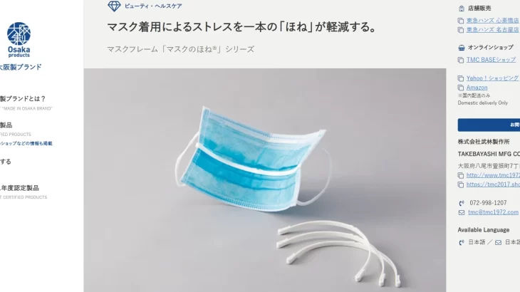 マスク着用によるストレスを一本の「ほね」で軽減します。他にもたくさんの素晴らしい商品が紹介されていますので一見の価値ありです。 大阪製ブランドのホームページはこちら:https://osaka-sei.m-osaka.com/product/1630 商品詳細・購入はこちらからTMC BASEショップ 、 TMC Yahoo!ショップ 、TMC アマゾンショップ 、TMC Shopify SHOP